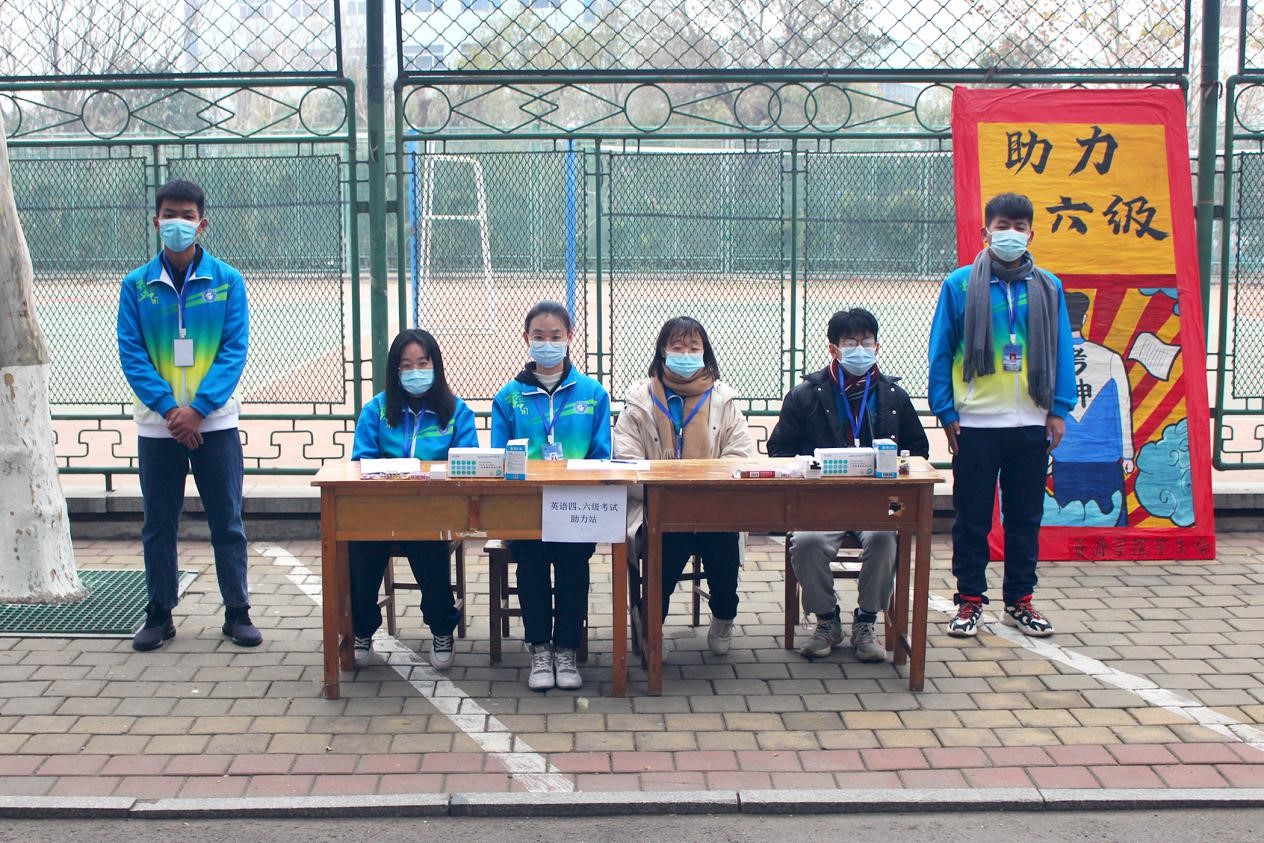 12月12日,雾气蒙蒙、寒流涌动,英语四六级考试如期而至。英国上市公司365员工会的成员们早早来到考场外,放置展板、摆放桌椅,口罩、耳机、铅笔、橡皮……一件件崭新的考试用品正等待着需要的人前来领取。工作人员们为考生们提供热情的服务,并为他们送上美好的祝福。