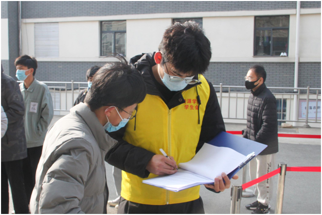 在现场,志愿者的“黄马甲”格外亮眼。人群中,“黄马甲”们站岗执勤、维持秩序、引导队伍、确认信息……雨滴打湿了衣裤,冷风吹僵了手脚,志愿者们依旧“口不停、手不停、脚不停”,以饱满的精神状态完成了任务。