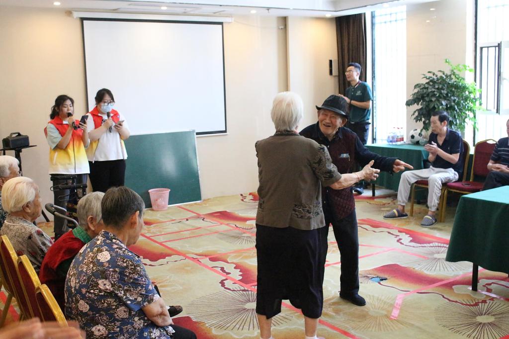 活动现场,志愿者们跳起了舞蹈《护花使者》,演唱了《夜空中最亮的星》《荷塘夜色》《那些花儿》等歌曲。在演唱《粉红色的回忆》时,两位老人即兴牵手起舞,将整场活动推向了高潮。精彩的演出、热烈的掌声、幸福的笑容,养老院内充满了欢声笑语。受到感染的老人们即兴表演了戏曲清唱、口风琴《我和我的祖国》,赢得现场阵阵掌声。表演间隙,志愿者陪同老人投掷保龄球、扔沙包,现场气氛热烈而温馨。